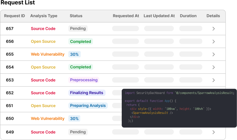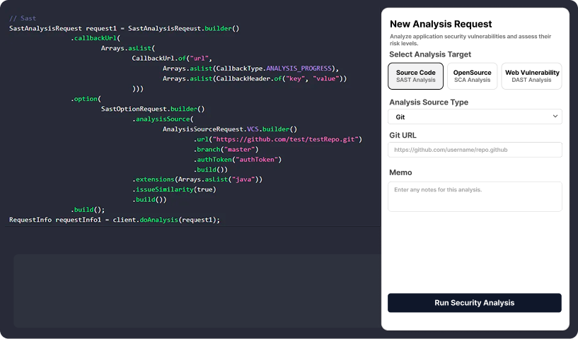 Analyze source code, open-source components, and web vulnerabilities with a single SDK call! And, easily integrate results into your internal security monitoring systems